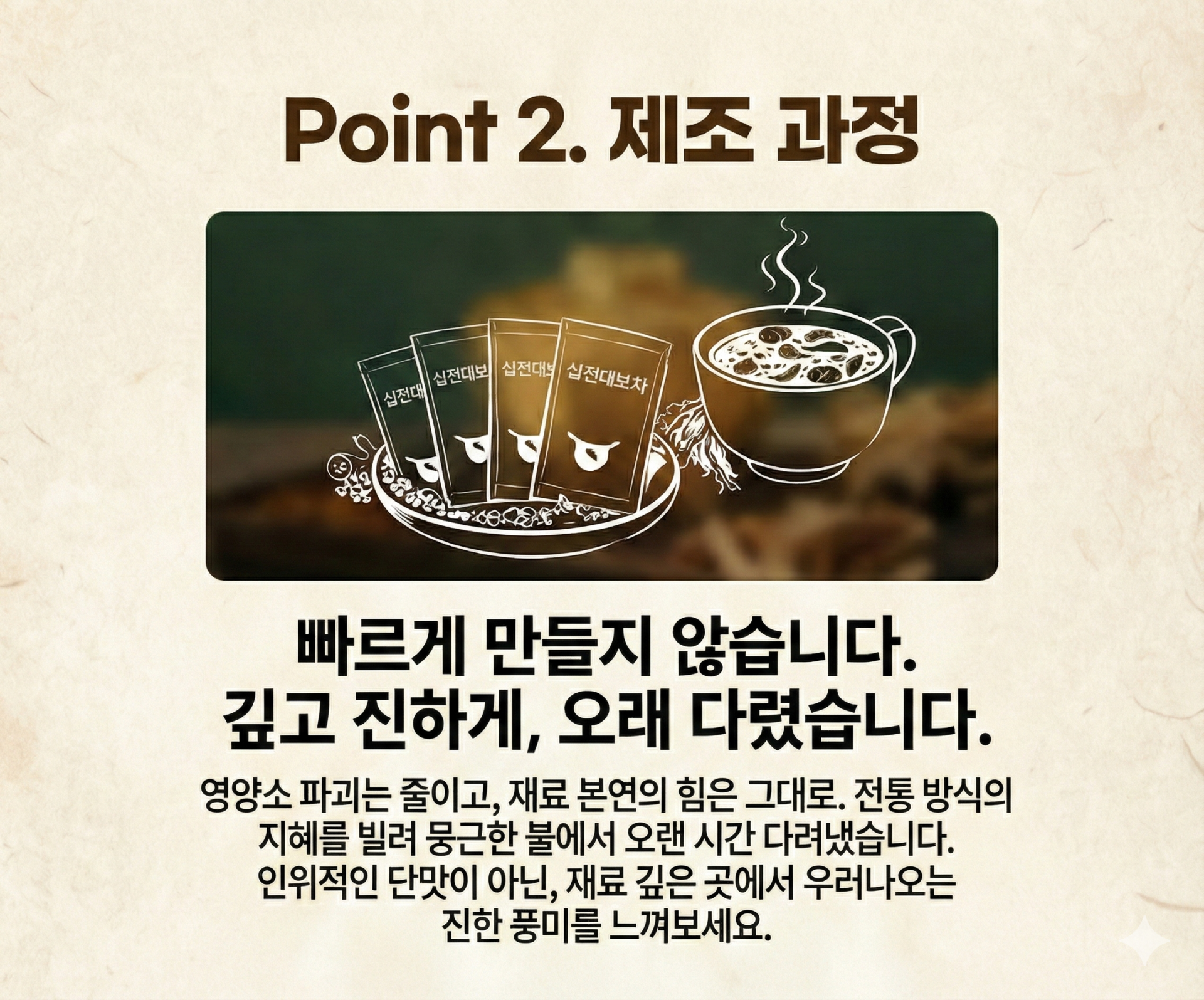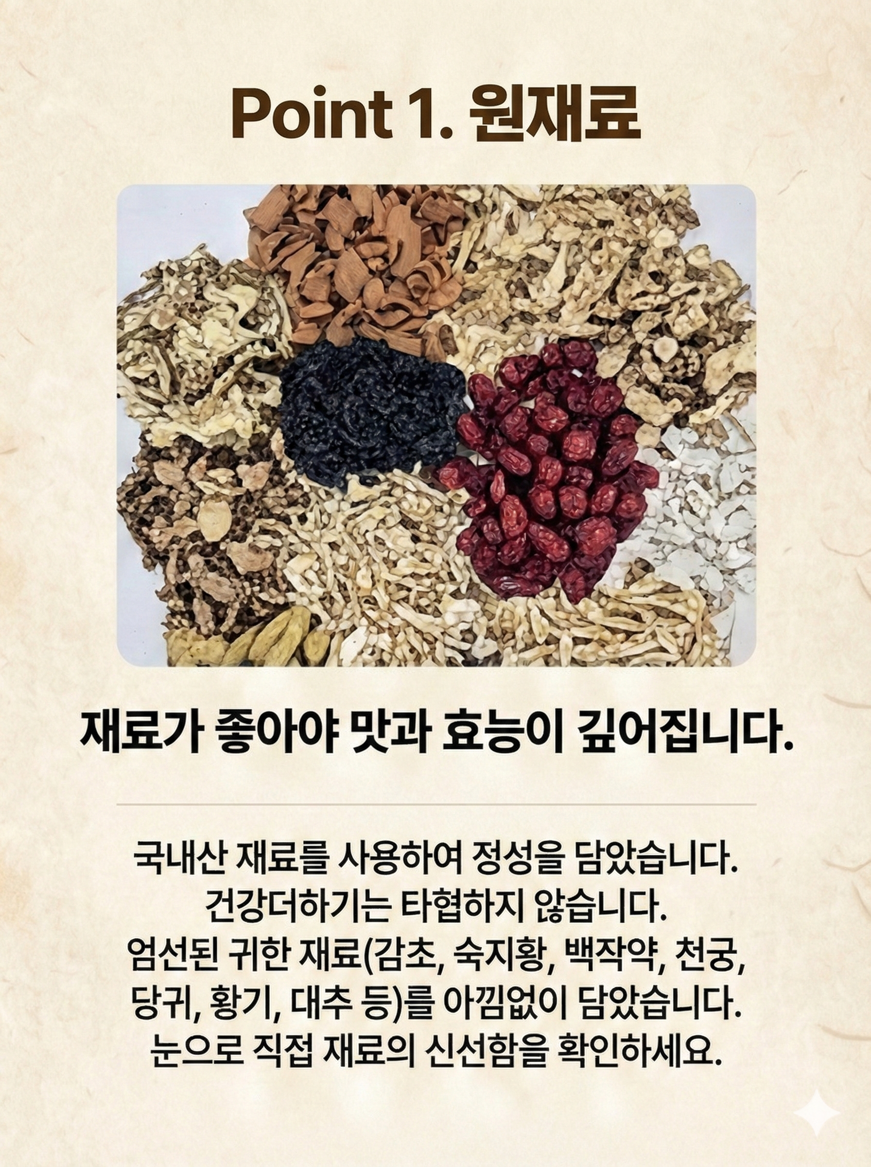 백작약(국내산), 대추(국내산), 당귀(국내산), 천궁(국내산), 황기(국내산), 숙지황(국내산), 건강(국내산), 백출(국내산), 백복령(국내산), 하수오(국내산), 감초(내몽고), 계피(베트남),